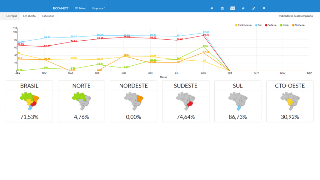 Dispomos de várias visões para gestão da força de vendas, que vão das vendas por representante ou grupo de produtos , metas físicas ou financeiras, além de dados por região.